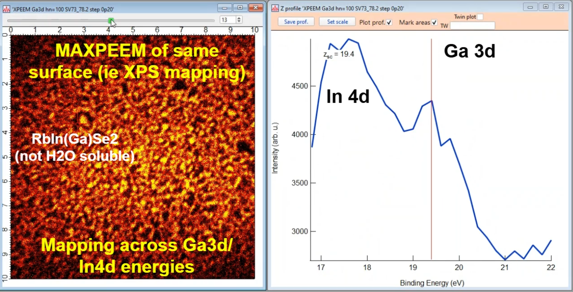 MAXPEEM XPS map of a Cu-free Ag(In,Ga)Se₂ surface after RbF treatment, showing nanoscale distribution of Ga and In signals. Data and image courtesy of Jan Keller (EMPA), measured at MAX IV Laboratory.